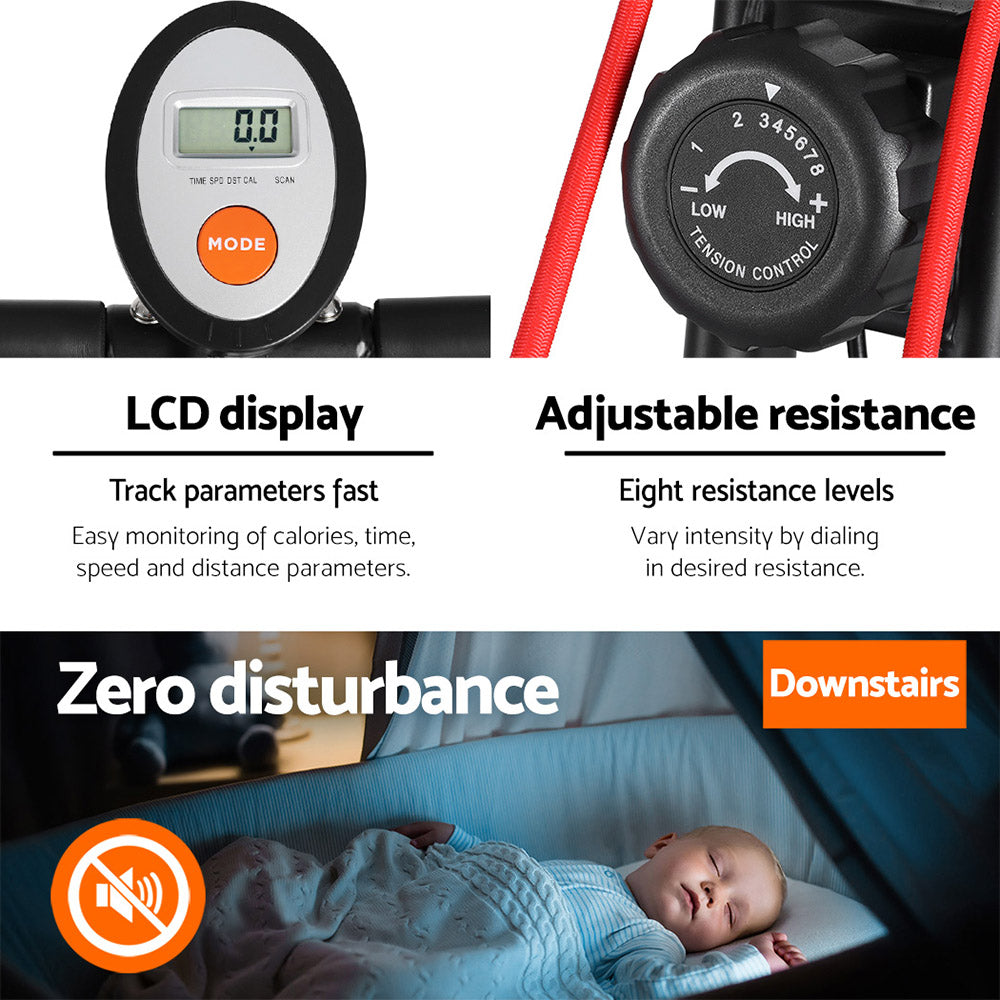 Looking for a compact and versatile exercise bike? Our Folding Exercise Bike features a sturdy steel X-frame and a silent magnetic resistance system, which offers eight resistance levels to provide a more challenging workout. The LCD monitor displays your progress during the workout, while the extra-wide comfortable seat and vertically adjustable seat can be adjusted to suit your preferences. With non-slip protective feet and a weight capacity of 100kg, this bike is durable and safe. Its foldable design also makes it easy to store and transport. The bonus resistance ropes add further variety to your exercise routine.