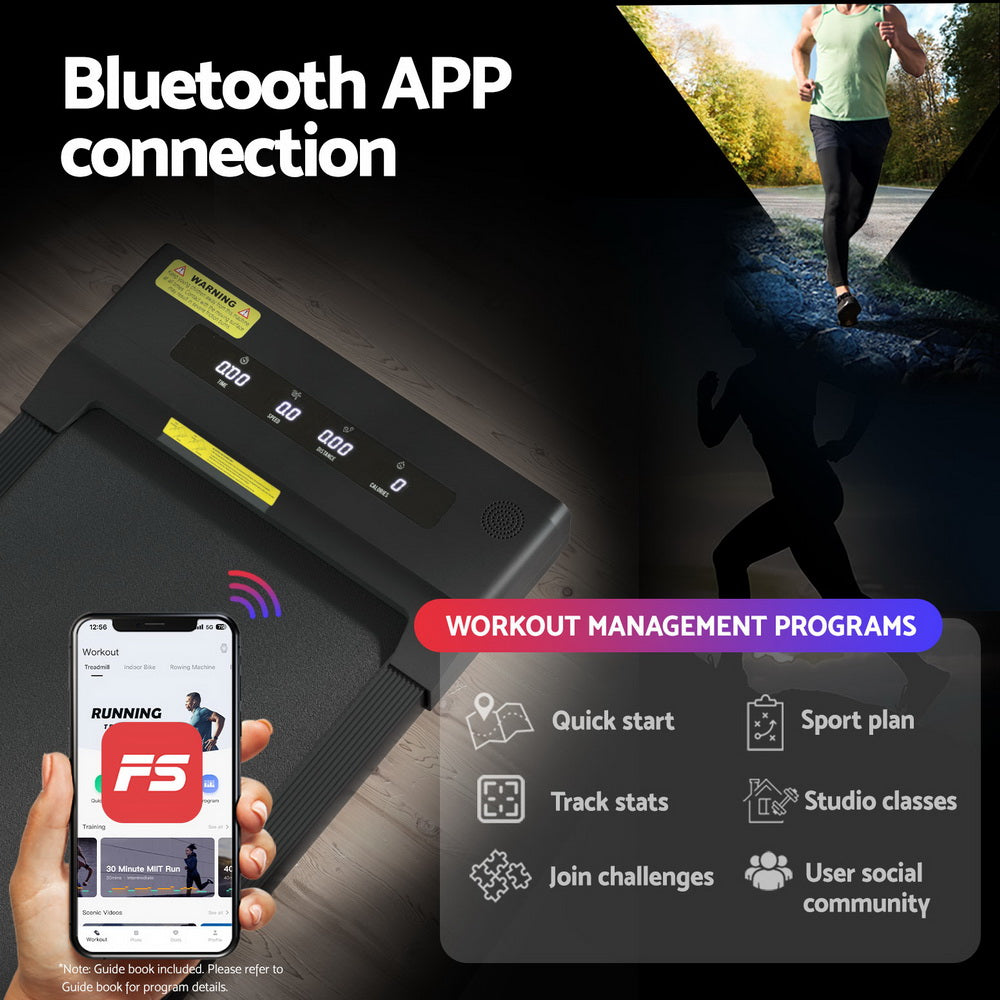 For a truly effective approach to weight loss and toning, our Everfit Walking Pad is your perfect companion. Compact and sturdy, the walking pad allows you to perform essential cardio exercises within the comfort of your home. It is foldable, easy to move, and comes ready to hit the ground running – no assembly required. Controlled by either the companion app or remote control, set up speeds of between 1km/h and 10km/h and monitor speed, time, distance and calories. Its powerful and energy-efficient motor produces smooth and seamless operation and the anti-slip belt phone holder makes your session a comfortable and controlled experience. The 400mm non-slip running belt uses an enhanced shock control system to help reduce the risk of joint injury, making the walking pad suitable for adults and seniors. When all the hard work is done, easily fold the compact walking pad and store away. Other great features include smooth wheels for easy mobility and Bluetooth speakers for entertainment while exercising. For health results that matter, our fitness walking pad is the one to run to.
